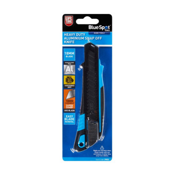 The Blue Spot Tools Heavy Duty Snap Off Knife is manufactured from aluminium for durability and comes with a contoured grip to aid user comfort. Complete with an 18mm, SK5 super sharp blade that comes in 10 segments, when one is blunt, safely and simply snap it off to reveal another razor sharp blade ready for use.